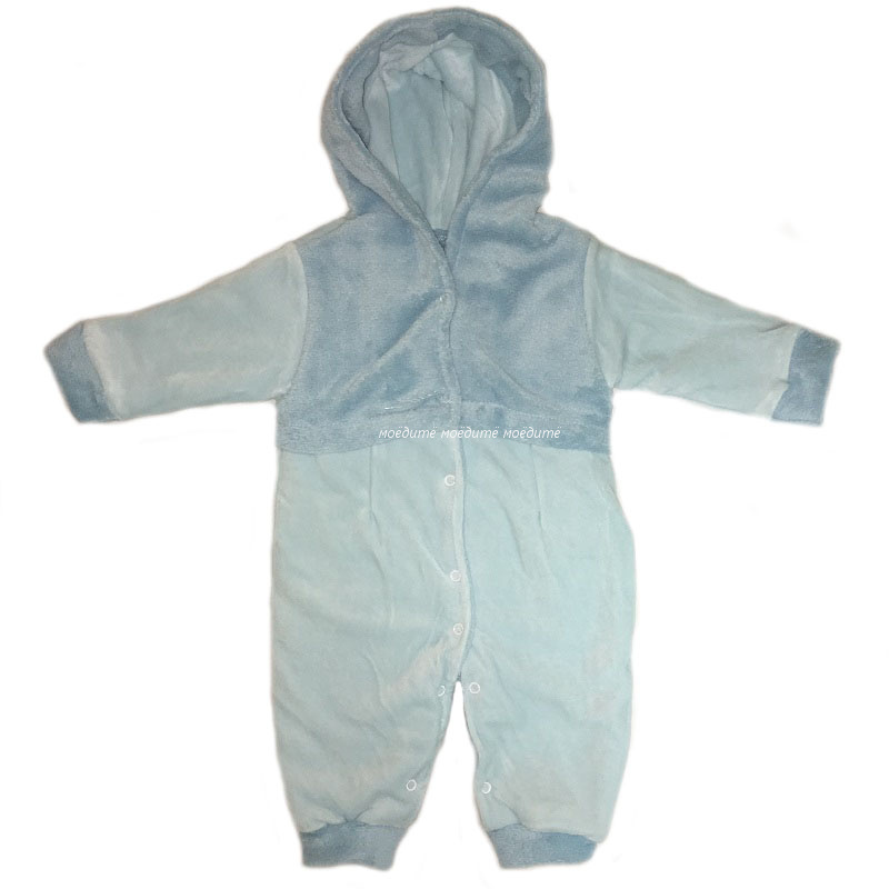 Комбинезон с капюшоном, с открытыми ножками, с длинными рукавами на манжете, спереди и между ножек на кнопочках. Комбинезон спереди украшен вшитой накидкой болеро, которая застёгивается также на кнопочки.