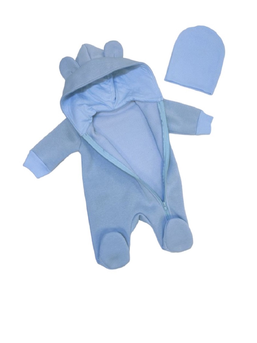 Комбинезон выполнен из футера двухнитки с начёсом. Спереди косая молния, капюшон на подкладке. У комбинезона закрытые ножки, на рукавах манжеты.